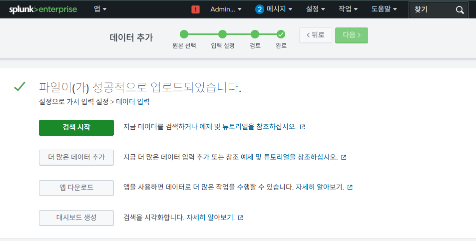 ※ splunk 시험판 사용 시 분석 용량 라이센스 고려해야함. splunk 시험판은 하루에 로그 500mb를 색인할 수 있음